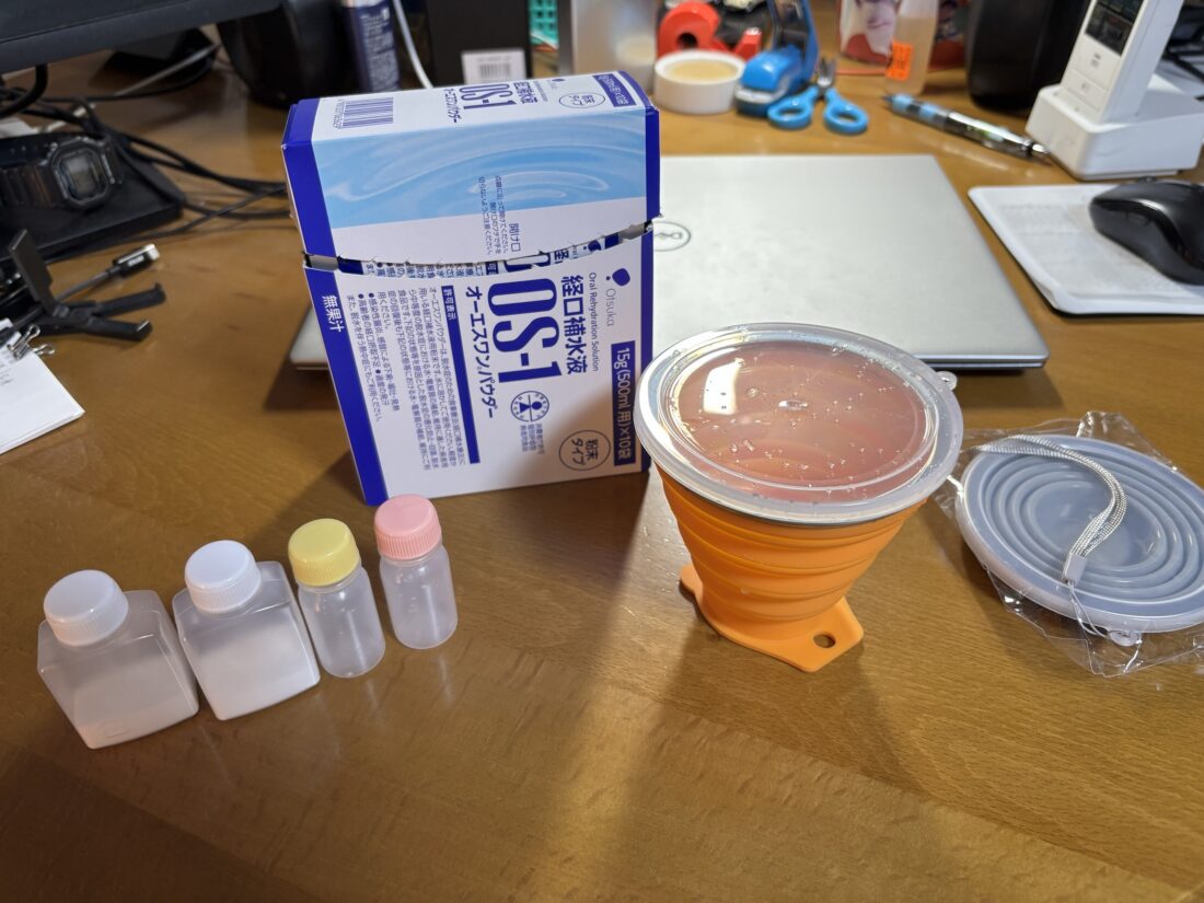 なので今回私は写真のような折り畳みコップとOS-1の粉末を用意しておき、給水所で水を入れて飲んだのですが、これが大正解でした。